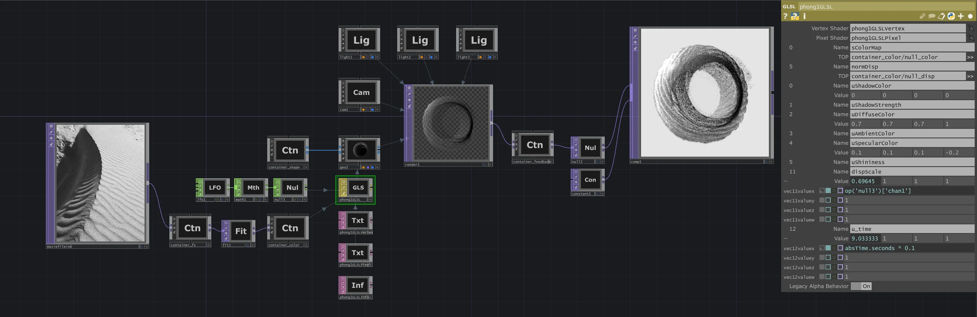 - Procedural Animation: A Low-Frequency Oscillator (LFO) is used to drive the dispScale uniform of the GLSL shader, creating a natural, pulsing animation without manual keyframing.
