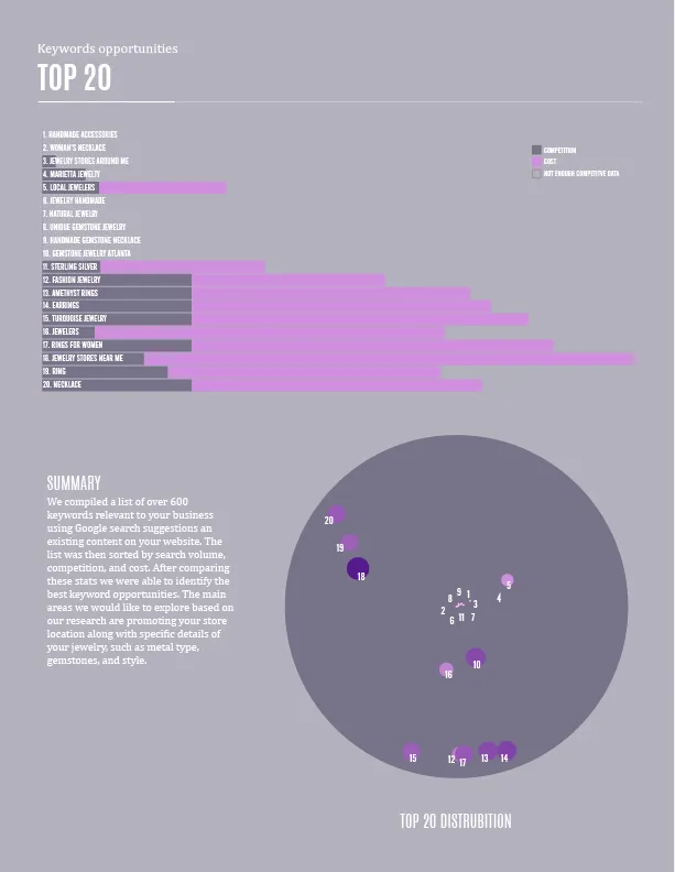 - Performed comprehensive keyword research (600+ terms) and used R/ggplot2 to generate actionable visualizations (scatter/bubble plots, top-20 charts).