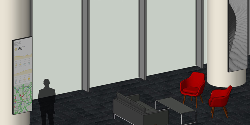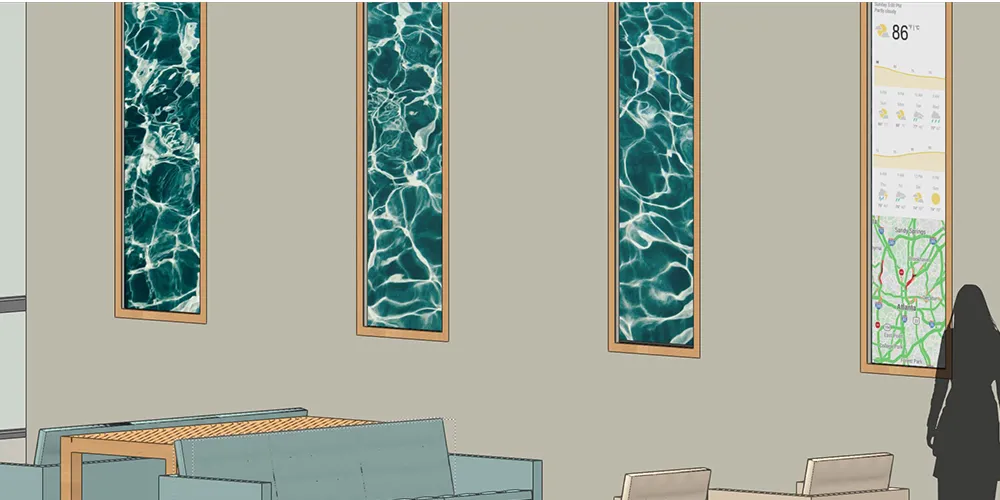 Traditional digital signage often contributes to visual noise, low engagement, and unnecessary energy use. The challenge was to imagine a signage system that feels architecturally integrated and visually compelling when idle, while becoming genuinely useful only when a viewer is present.