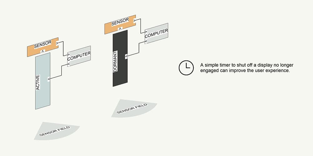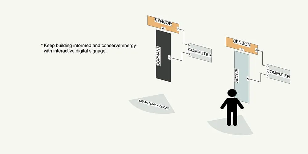 - Motion or proximity sensors trigger a seamless transition to Information Mode, presenting maps, wayfinding, schedules, or other contextual content when a viewer approaches.