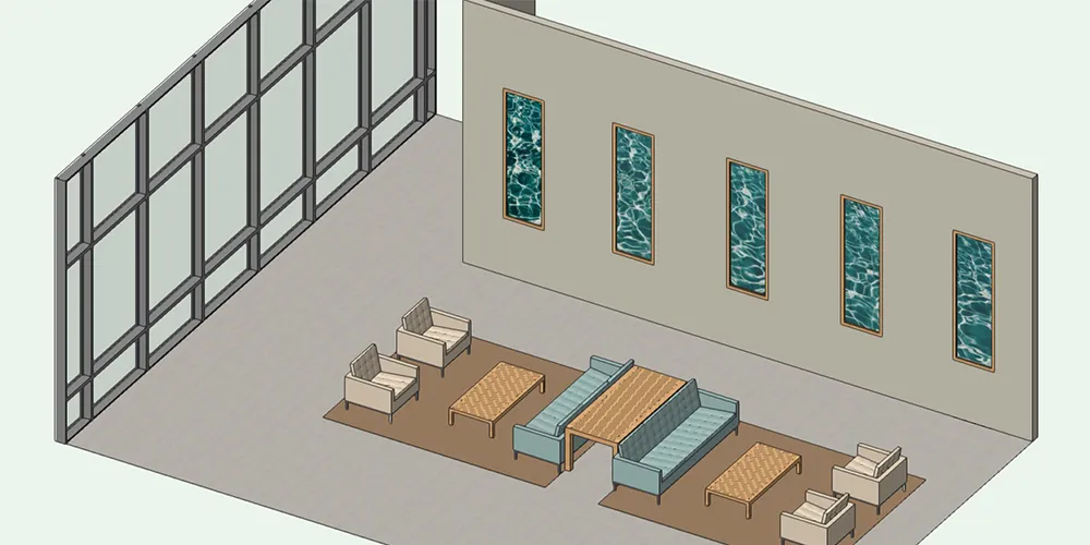 - In passive mode, displays present original generative artworks created with TouchDesigner and GLSL, intended to complement the surrounding architecture rather than compete for attention.